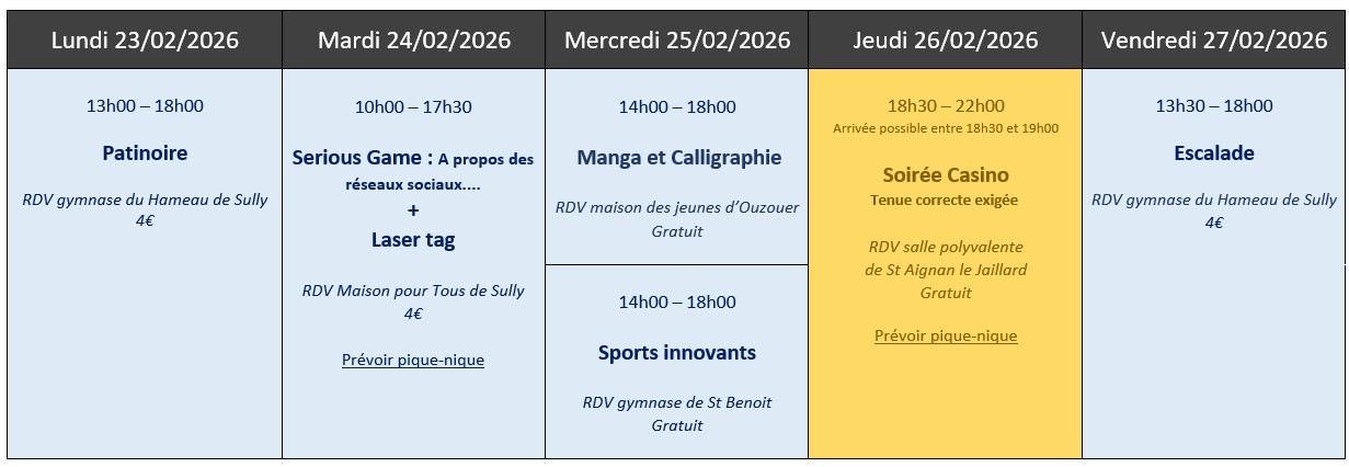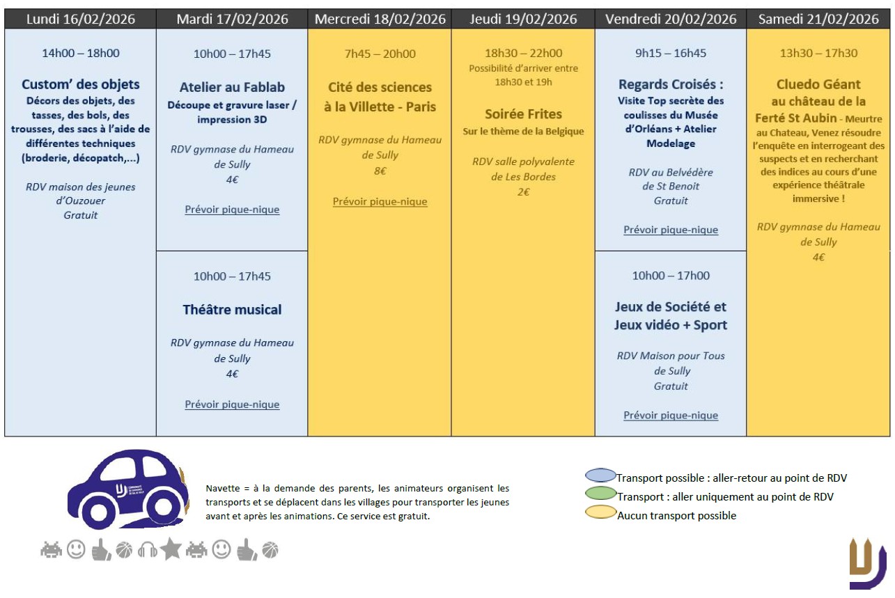 2€, 17h30 – 21h, rendez-vous maison des jeunes d’Ouzouer, avec navette possible au départ des collèges de Sully et des Bordes à 17h, pensez à prévenir le collège si nous récupérons votre enfant à la sortie de l’établissement ainsi qu’à nous transmettre le justificatif. Pour les jeunes SANS navette, possibilité d’arrivée à la Maison des jeunes à partir de 17h30 jusqu’à 19h.